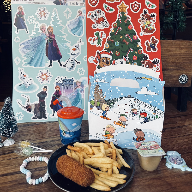 Blije kindergezichtjes met deze leuke Kerstmis kidsbox! Goed gevuld met friet, een kroket, appelmoes, snoepje en nu ook nog een groot stickervel met leuke Kerst-raamstickers.